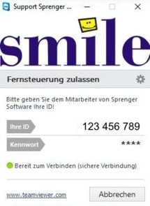 Bitte gebe nun dem Smile-Supportmitarbeiter die angegebene ID telefonisch durch. Wurde der Teamviewer aus dem Smile-Startbildschirm heraus gestartet, muss kein Kennwort dem Smile-Supportmitarbeiter benannt werden. Hier ist für Smile-Kunden ein Kennwort fest vergeben. Dies erleichtert die Verbindung und es kommt nicht zu Übermittlungsfehlern.