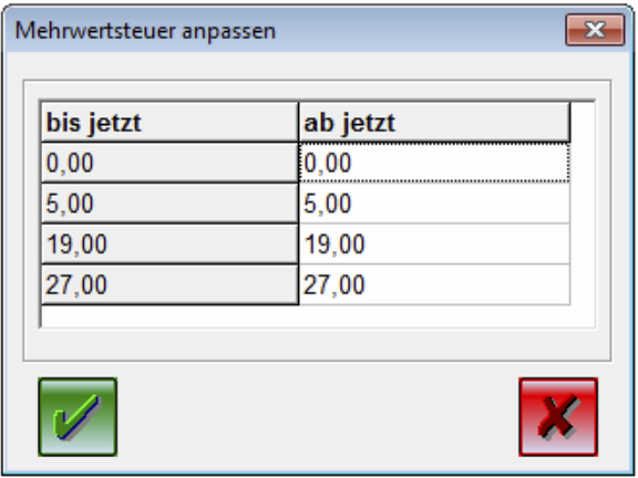 Um einen oder mehrere Steuersätze anzupassen, trägst Du einfach in die Spalte "ab jetzt" denen Steuersatz ein. Wenn Du alles nach Deinen Wünschen geändert hast, klickst Du auf OK und beantwortest die Nachfrage mit JA.