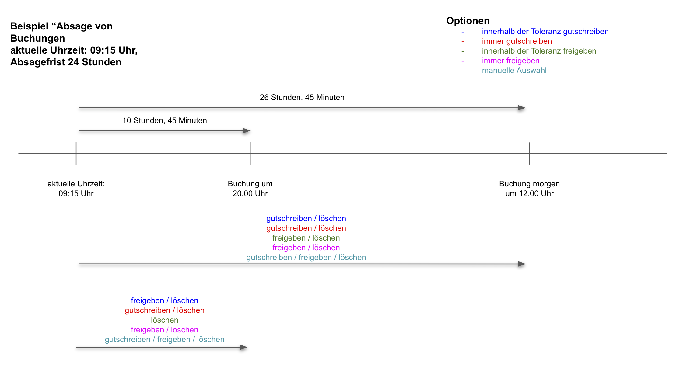 Du hast eine Toleranz bei der Absage der Buchung, bis zu der die eine Aktion (zum Beispiel freigeben) und danach eine andere Aktion (zum Beispiel Gutschreiben) erfolgt.