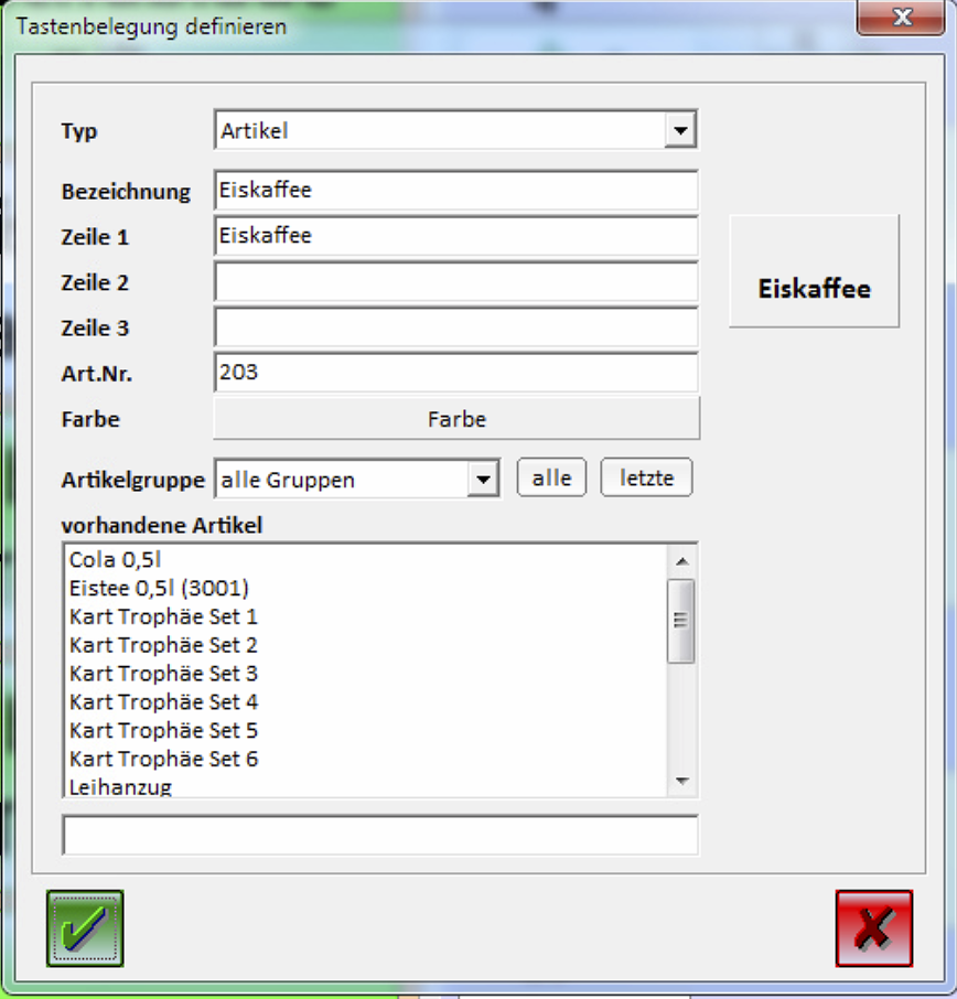Wähle den Artikel aus der Liste der vorhanden Artikel aus. smileCash füllt dann die Felder "Bezeichnung", "Zeile 1", "Zeile 2" und "Zeile 3" automatisch aus (ein Feld auf dem Boniertableau hat maximal drei Zeilen. Neben den Einträgen für Zeile 1 bis 3 siehst eine Vorschau). Die Verteilung der "Worte" auf die Zeilen 1 bis 3 erfolgt über die Trennung bei Leerzeichen.